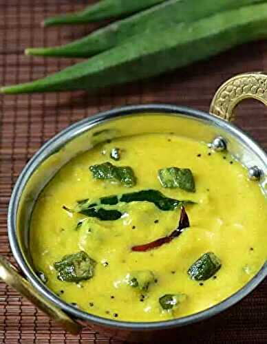 Vendakkai Mor Kuzhambu is a comforting, tangy curry featuring tender okra cooked in a flavorful yoghurt sauce.